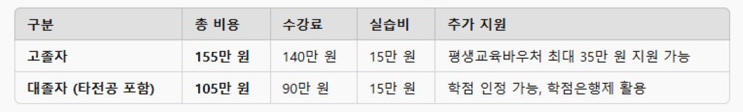 - 국민내일 배움 카드는 적용 불가 대신 1급 대비 과정에서 사용 가능